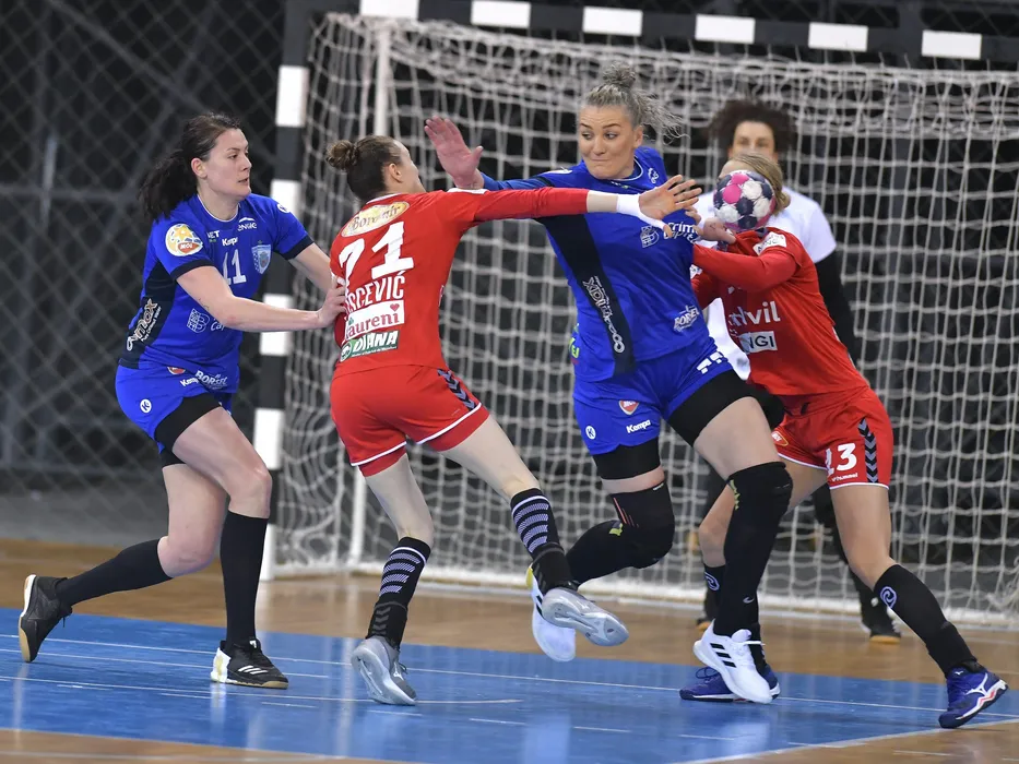 Gabriela Perianu si Crina Elena Pintea in meciul de handbal feminin dintre SCM Ramnicu Valcea si CSM Bucuresti, contand pentru Liga Florilor, desfasurat fara spectatori in Sepsi Arena din Sfantu Gheorghe, joi 18 februarie 2021. © FOTO:Razvan Pasarica/SPORT PICTURES