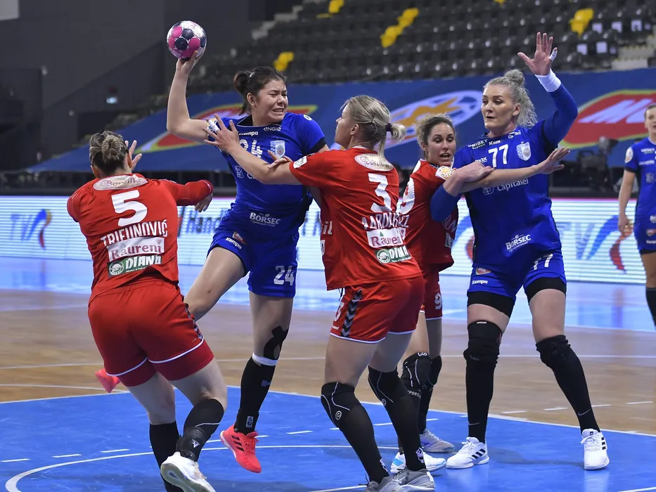 Martine Smeets si Crina Elena Pintea in meciul de handbal feminin dintre SCM Ramnicu Valcea si CSM Bucuresti, contand pentru Liga Florilor, desfasurat fara spectatori in Sepsi Arena din Sfantu Gheorghe, joi 18 februarie 2021. © FOTO:Razvan Pasarica/SPORT PICTURES
