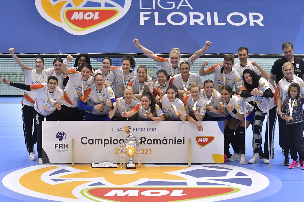 Handbalistele de la CSM Bucuresti impreuna cu staff-ul se bucura dupa castigarea campionatului la premierea de dupa meciul de handbal feminin impotriva celor de la SCM U Craiova, contand pentru Liga Florilor, desfasurat fara spectatori in Sala Ioan Kunst Ghermanescu-Polivalenta din Bucuresti, luni 31 mai 2021. © FOTO:Razvan Pasarica/SPORT PICTURES