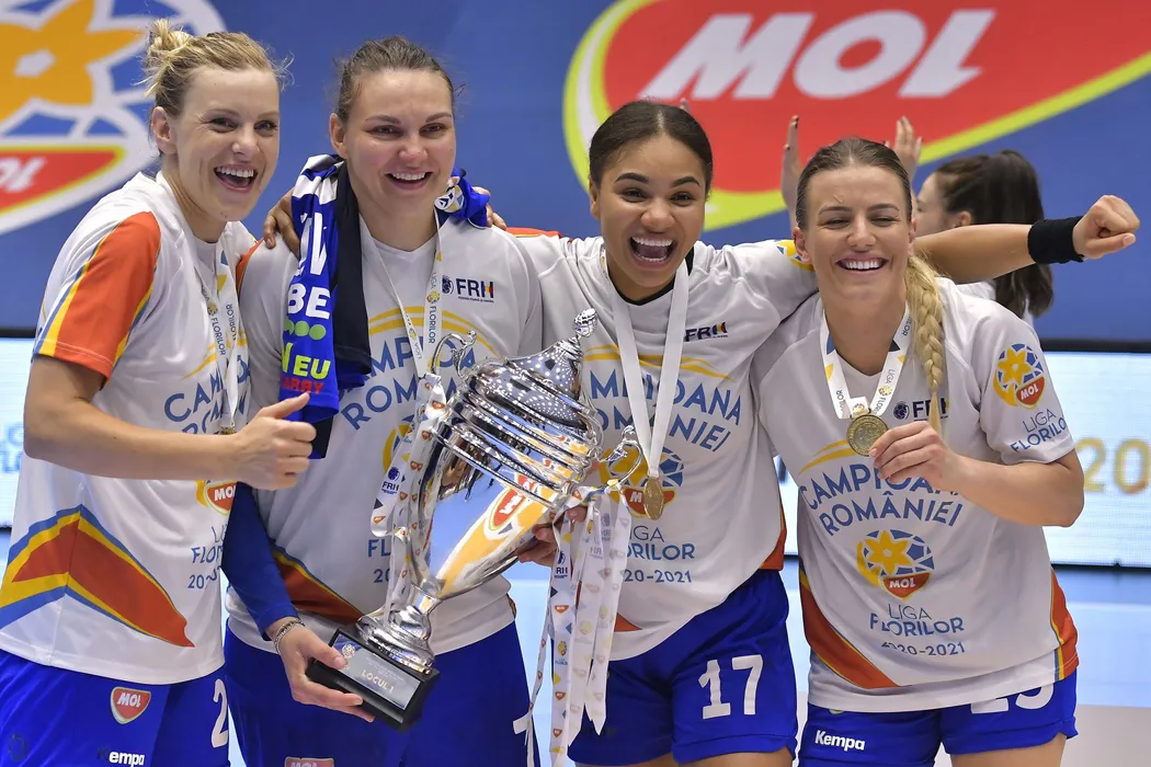 Handbalistele de la CSM Bucuresti Barabara Lazovic, Dragana Cvijic si Elizabeth Omoregie se bucura dupa castigarea campionatului la premierea de dupa meciul de handbal feminin impotriva celor de la SCM U Craiova, contand pentru Liga Florilor, desfasurat fara spectatori in Sala Ioan Kunst Ghermanescu-Polivalenta din Bucuresti, luni 31 mai 2021. © FOTO:Razvan Pasarica/SPORT PICTURES