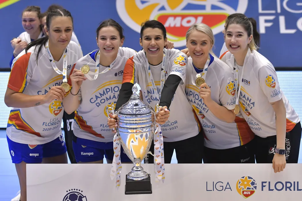 Handbalistele de la CSM Bucuresti Bianca Maria Bazaliu, Stefania Oana Jipa, Denisa Stefania Dedu, Laura Moisa si Denisa Andreea Valcan se bucura dupa castigarea campionatului la premierea de dupa meciul de handbal feminin impotriva celor de la SCM U Craiova, contand pentru Liga Florilor, desfasurat fara spectatori in Sala Ioan Kunst Ghermanescu-Polivalenta din Bucuresti, luni 31 mai 2021. © FOTO:Razvan Pasarica/SPORT PICTURES