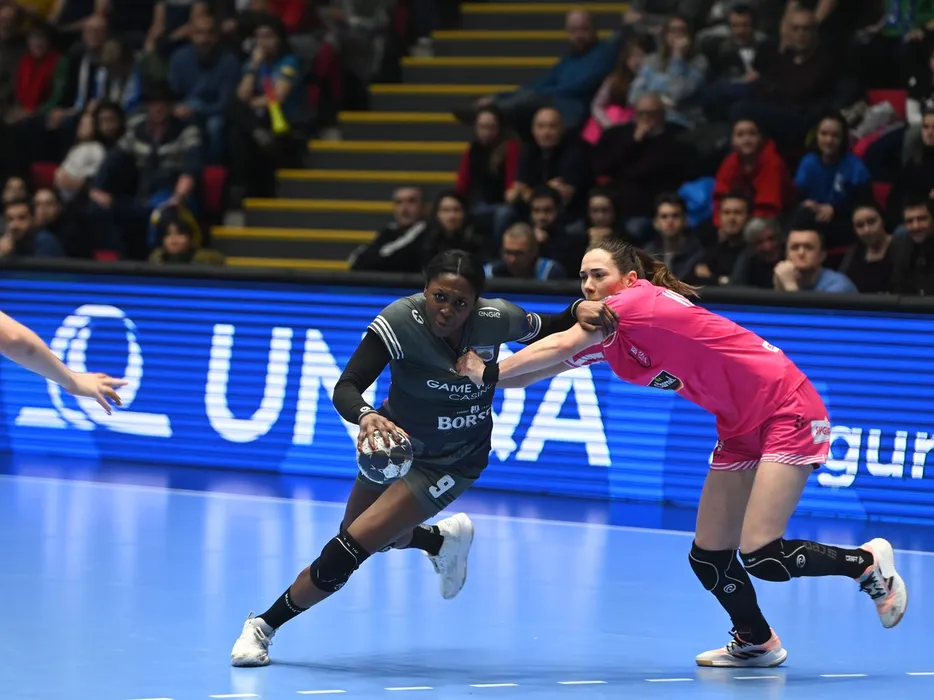 Grace Zaadi Deuna si Monika Kobylinska in meciul de handbal feminin dintre CSM Bucuresti si Brest Bretagne Handball, contand pentru Liga Campionilor, desfasurat in Sala Polivalenta-Ioan Kunst Ghermanescu din Bucuresti, duminica 5 februarie 2023.,Image: 754237031, License: Rights-managed, Restrictions: , Model Release: no