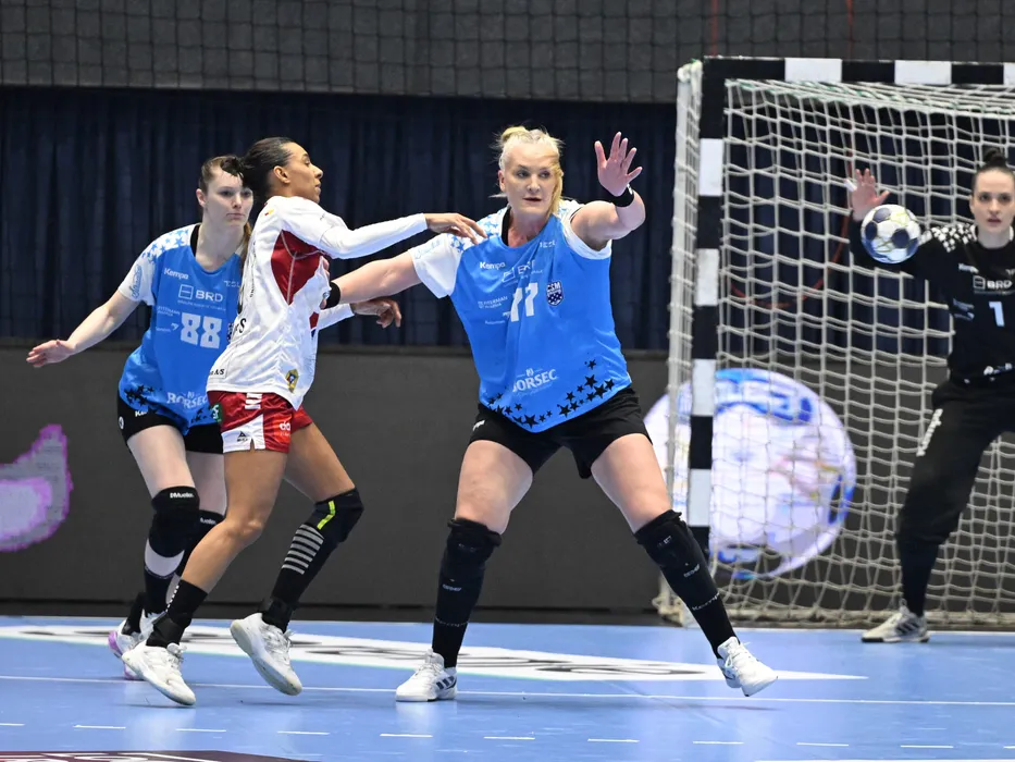 Anne Mette Hansen si Crina Elena Pintea in meciul de handbal feminin dintre CSM Bucuresti si Ikast Handbold, din cadrul Ligii Campionilor, desfasurat in Sala Polivalenta Ioan Kunst Ghermanescu din Bucuresti, sambata 21 februarie 2026. © FOTO:Razvan Pasarica/SPORT PICTURES