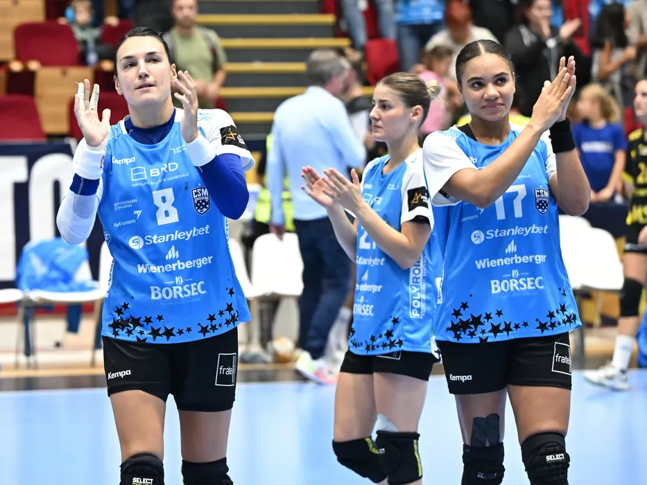 Handbalistele bucurestene Cristina Georgiana Neagu si Elizabeth Omoregie aplauda publicul dupa meciul de handbal feminin dintre CSM Bucuresti si Nykobing Falster Handbold, contand pentru Liga Campionilor, desfasurat in Sala Polivalenta-Ioan Kunst Ghermanescu din Bucuresti, duminica 6 octombrie 2024. © FOTO:Razvan Pasarica/SPORT PICTURES