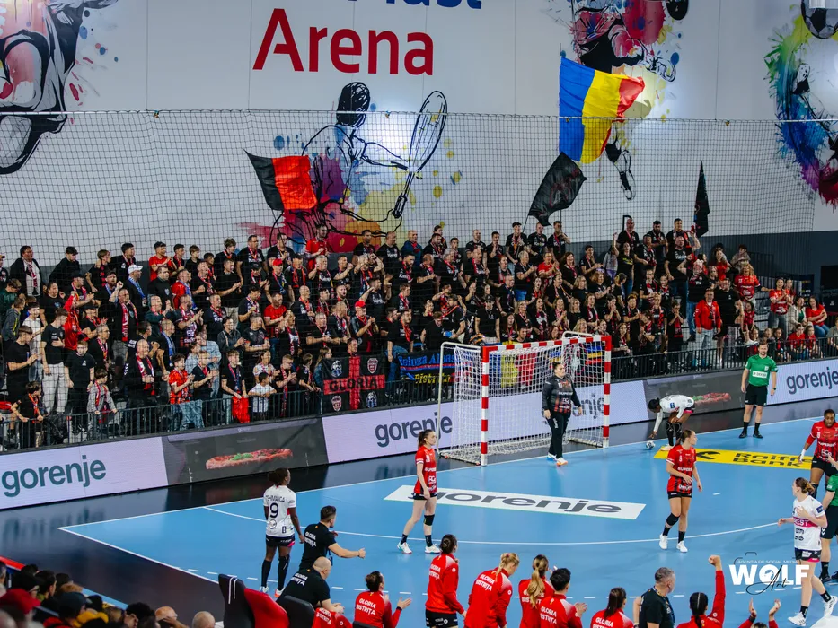 Galeria bistriteana cu steaguri si fulare isi incurajeaza favoritele la meciul de handbal feminin dintre Gloria Bistrita și Brest Bretagne Handball, contand pentru Sferturi de finala Liga Campionilor, desfasurat in Sala Polivalenta Teraplast Arena din Bistrita, sambata 18 aprilie 2026. © FOTO:Bianca Salagean/SPORT PICTURES