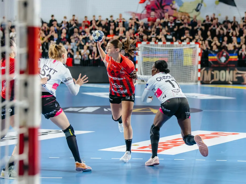 Larissa Nusser si Onacia Ondono in meciul de handbal feminin dintre Gloria Bistrita și Brest Bretagne Handball, contand pentru Sferturi de finala Liga Campionilor, desfasurat in Sala Polivalenta Teraplast Arena din Bistrita, sambata 18 aprilie 2026. © FOTO:Bianca Salagean/SPORT PICTURES