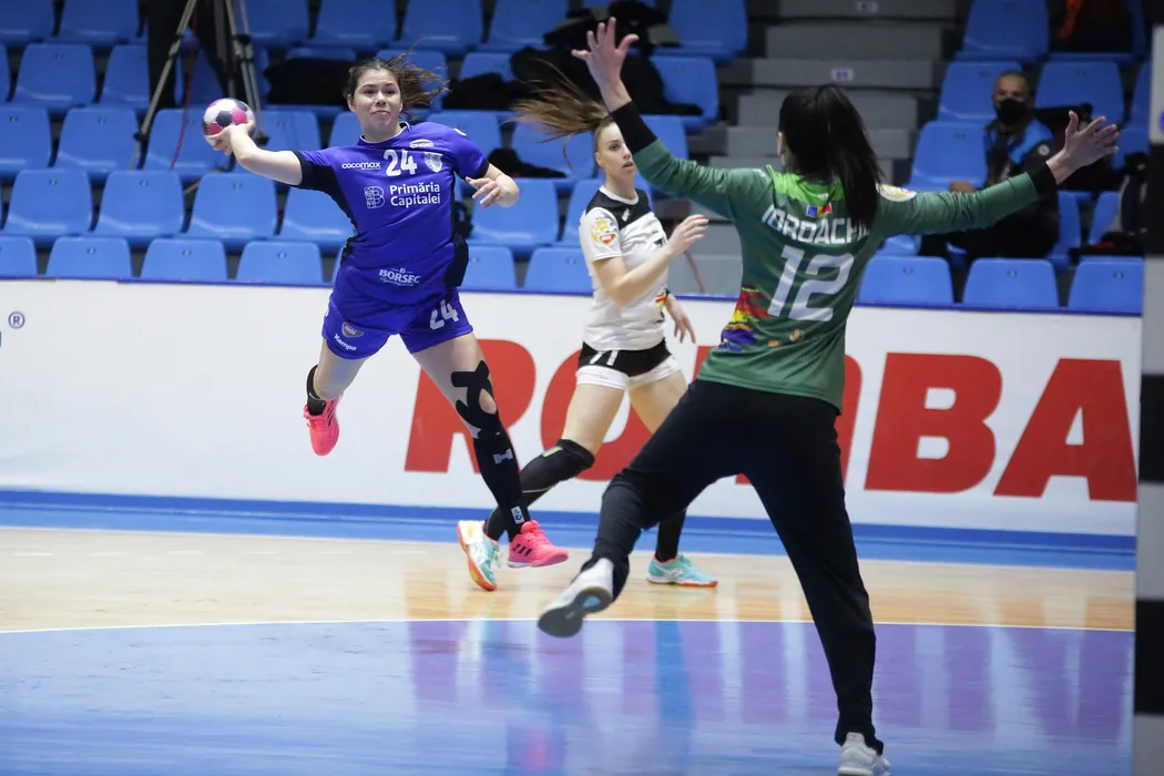 Martine Smeets si Alina Iordache in meciul de handbal feminin dintre CSM Bucuresti si SCM Gloria Buzau, contand pentru Liga Florilor, desfasurat fara spectatori in Sala Polivalenta din Bistrita, lunii 26 aprilie 2021. © FOTO:Paul Ursachi/SPORT PICTURES
