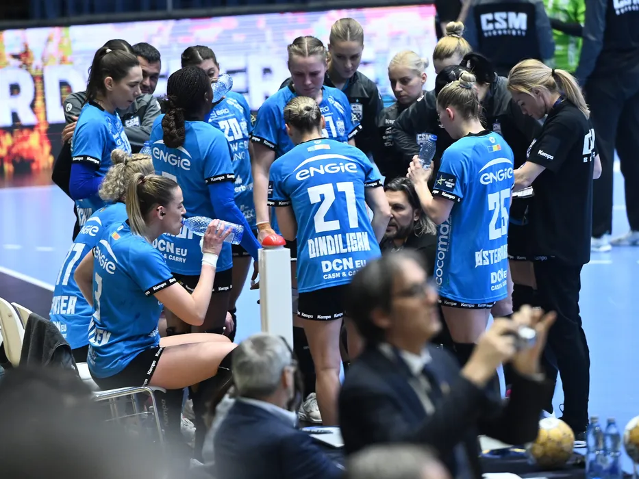 Handbalistele bucurestene la un timeout alaturi de antrenorul lor Adrian Vasile in meciul de handbal feminin dintre CSM Bucuresti si WHC Buducnost Bemax, contand pentru Liga Campionilor, desfasurat in Sala Polivalenta-Ioan Kunst Ghermanescu din Bucuresti, duminica 7 ianuarie 2024. © FOTO:Razvan Pasarica/SPORT PICTURES
