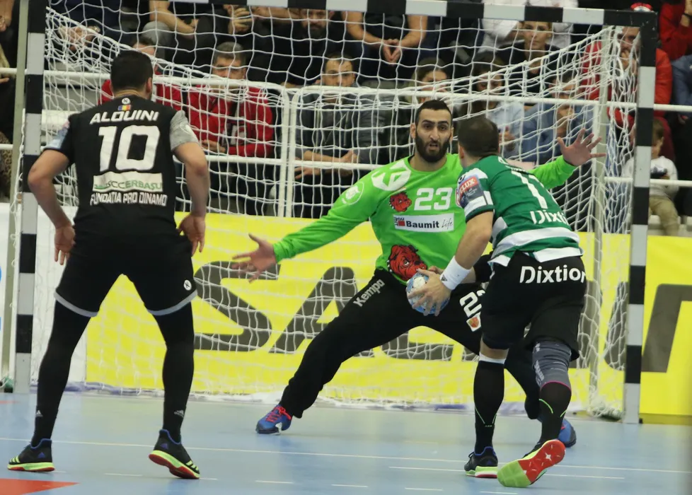 Saeid Heidarirad (C), de la CS Dinamo Bucuresti, apara in meciul de handbal masculin contra formatiei Sporting CP, din returul barajului pentru optimile de finala ale Ligii Campionilor, joi, 28 februarie 2019, in Bucuresti. .GEORGE FILIP / MEDIAFAX FOTO