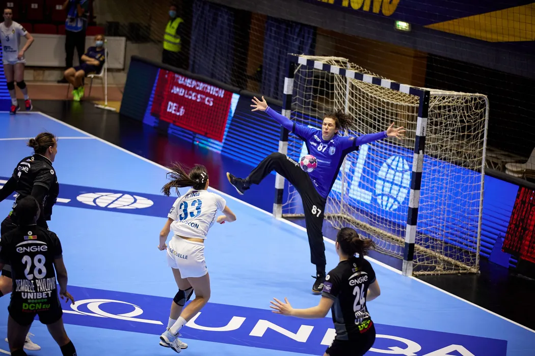 Ekaterina Ilina si Jelena Grubisic in meciul de handbal feminin dintre CSM Bucuresti si CSKA Moscova, contand pentru Liga Campionilor, desfasurat fara spectatori in Sala Ion Kunst Ghermanescu-Polivalenta din Bucuresti, sambata 3 aprilie 2021. © FOTO:Sabin Malisevschi/SPORT PICTURES