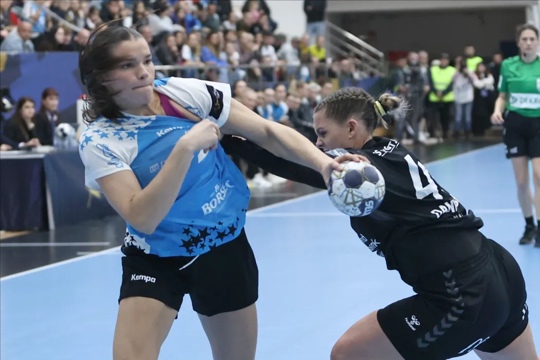 Kristina Novak si Hege Holgersen Danielsen in meciul de handbal feminin dintre CSM Bucuresti si Sola HK, contand pentru Liga Campionilor, desfasurat in Sala Polivalenta Dinamo din Bucuresti, sambata 15 noiembrie 2025. © FOTO:Gheorghe Fluster/SPORT PICTURES