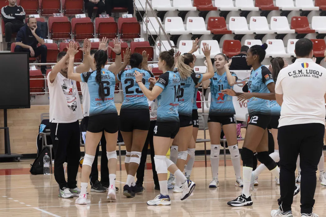 Voleibalistele din Lugoj se încurajează la startul meciului de volei feminin între CS Dinamo București și CSM Lugoj, contând pentru Divizia A1 Feminin, desfășurat în Sala Polivalentă Dinamo din București, sâmbătă 19 octombrie 2024. © FOTO: Mihai NEACȘU/SPORT PICTURES