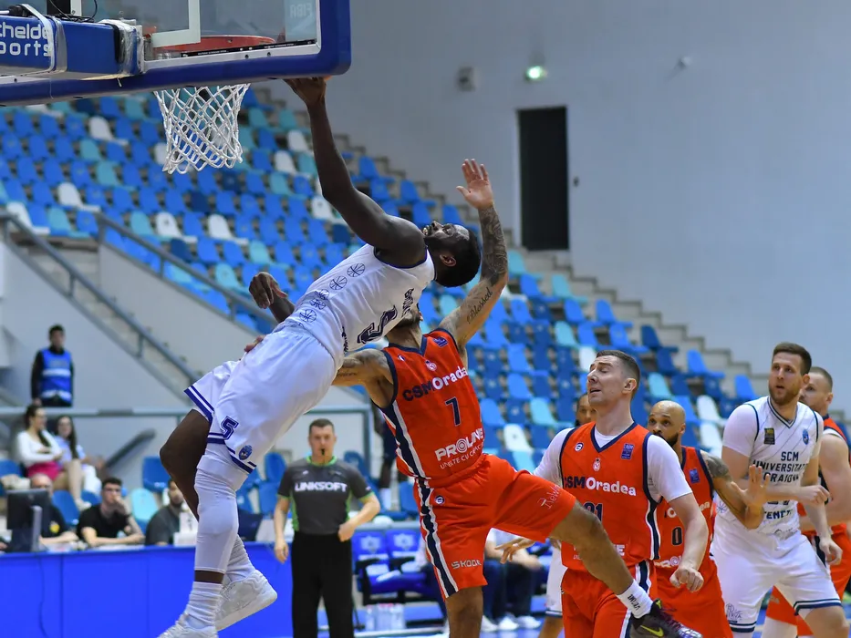 Devante Juwon Brooks si Brandon Robert Brown, Paulius Petrilevicius in meciul de baschet masculin dintre SCMU Craiova si CSM CSU Oradea, contând pentru Liga Nationala de baschet masculin Getica 95, desfasurat în Sala Polivalenta din Craiova, miercuri 7 mai 2025. © FOTO: Remus Badea/SPORT PICTURES