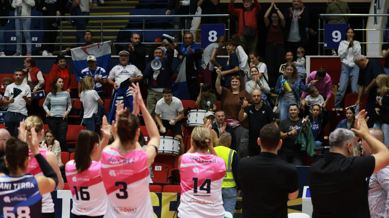 Jucătoarele din Voluntarti salută galeria după meciul de volei feminin între CSO Voluntari și CSM Târgoviște, contând pentru SuperCupa României Feminin 2024 desfășurat în Sala Polivalentă din București, duminică 29 septembrie. © FOTO: Marian BURLACU/SPORT PICTURES