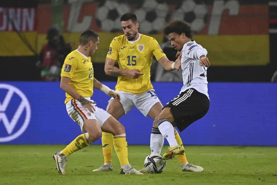 Leroy SANE (GER), action, duels versus Andrei BURCA (ROM) and Florinel COMAN (ROM). Soccer Laenderspiel, World Cup Qualification Group J matchday 7, Germany (GER) - Romania (ROM), on October 8th, 2021 in Hamburg, Volksparkstadion.,Image: 637239246, License: Rights-managed, Restrictions: GERMANY OUT