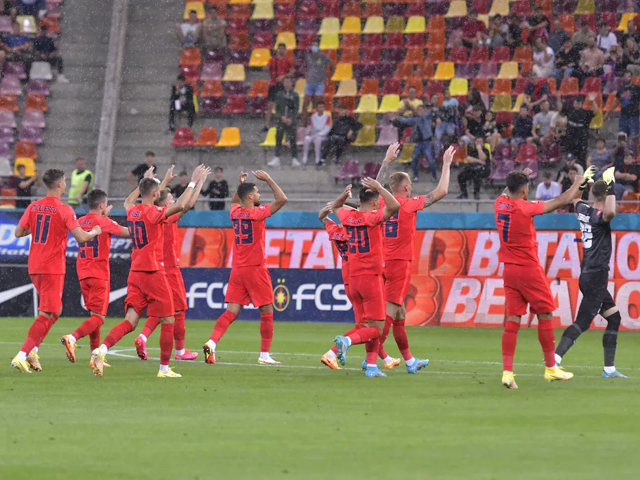 Fotbalistii stelisti saluta galeria la startul meciului de fotbal dintre FCSB si Chindia Targoviste, contand pentru Superliga Superbet, desfasurat pe Arena Nationala din Bucuresti, duminica 14 august 2022. © FOTO:Razvan Pasarica/SPORT PICTURES