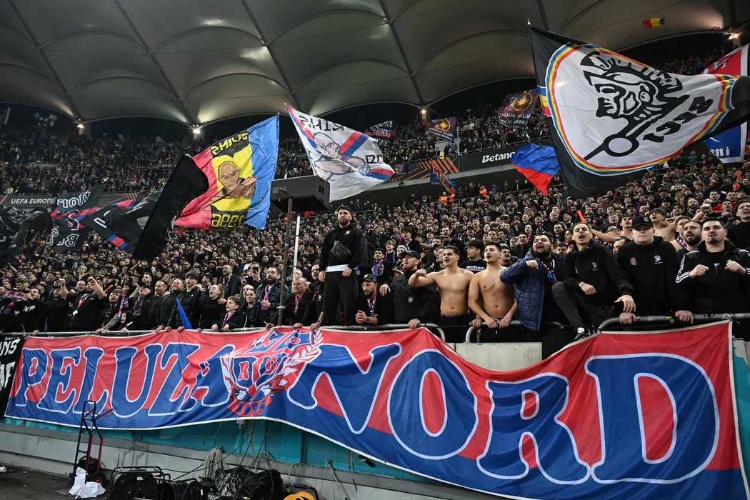 Galeria ros albastra Peluza Nord isi aplauda favoritii dupa meciul de fotbal dintre FCSB si Olympique Lyon, din cadrul UEFA Europa League, desfasurat pe Arena Nationala din Bucuresti, joi 6 martie 2025. © FOTO:Razvan Pasarica/SPORT PICTURES