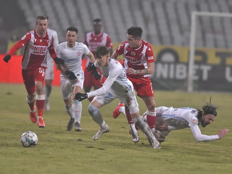 Octavian George Popescu, Steliano Filip si Ante Vukusic la faza eliminarii dinamovistului in meciul de fotbal dintre Dinamo Bucuresti si FCSB, contand pentru Liga 1 Casa Pariurilor, desfasurat fara spectatori pe Stadionul Dinamo din Bucuresti, miercuri 3 februarie 2021. © FOTO:Razvan Pasarica/SPORT PICTURES