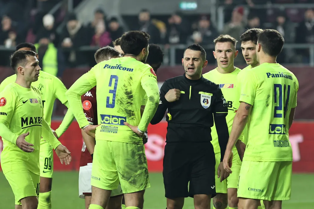 Arbitrul central Iulian Calin in mijlocul iesenilor in meciul de fotbal dintre FC Rapid 1923 Bucuresti si Poli Iasi, din cadrul Superligii Superbet, desfasurat pe Superbet Arena-Giulesti din Bucuresti, luni 20 ianuarie 2025. © FOTO: Gheorghe Fluster/SPORT PICTURES