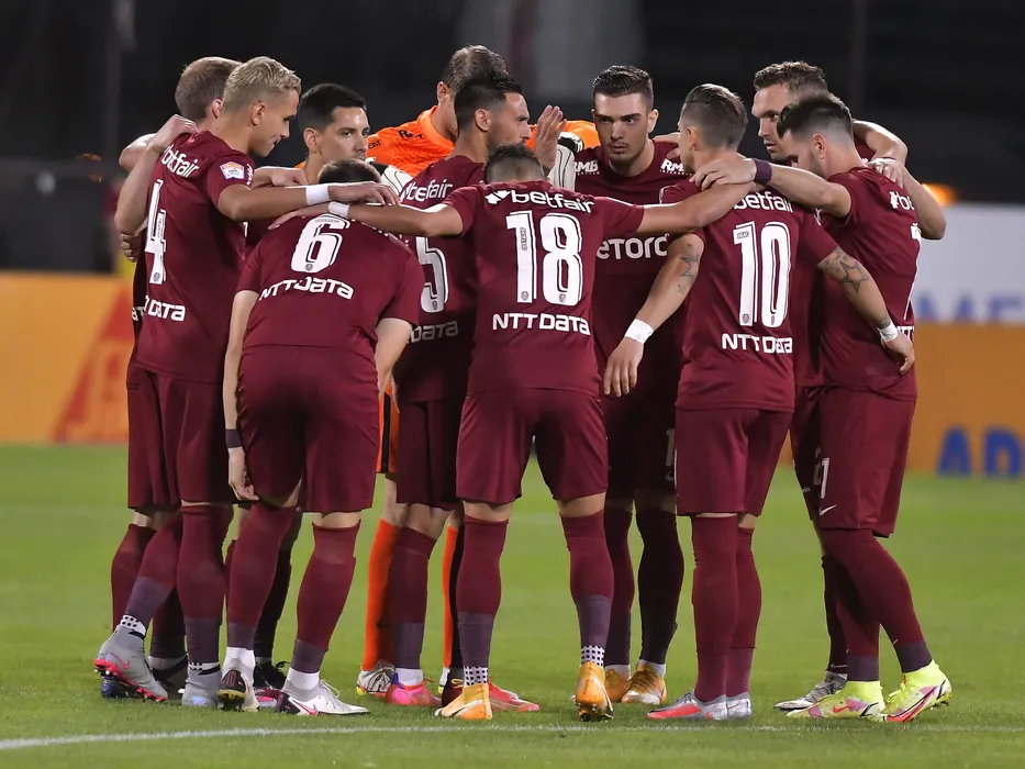 Fotbalistii clujeni printre care Cristian Marian Manea, Jonathan Emanuel Rodriguez, Mario Camora, Cristian Marian Manea si Gabriel Debeljuh se incurajeaza inaintea meciului de fotbal dintre CFR Cluj si Steaua Rosie Belgrad, contand pentru Play-off-ul UEFA Europa League, desfasurat pe Stadionul Dr. Constantin Radulescu din Cluj Napoca, joi 26 august 2021. © FOTO:Razvan Pasarica/SPORT PICTURES