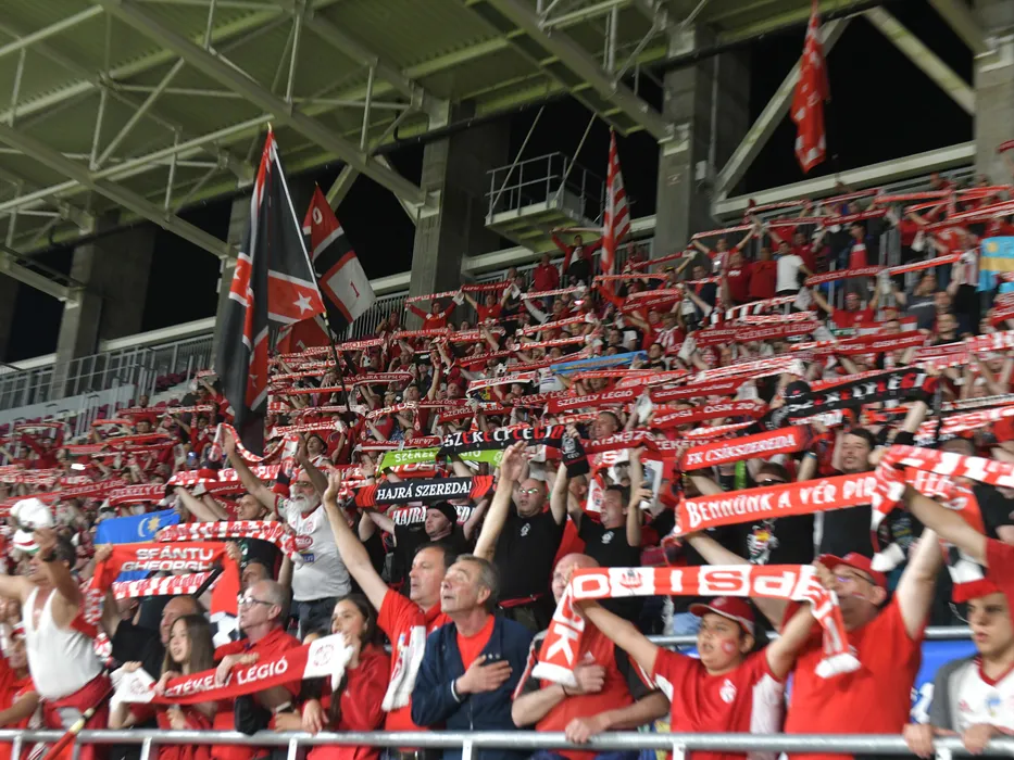 Suporterii de la Sepsi isi incurajeaza favoritii la meciul de fotbal dintre Sepsi OSK Sfantu Gheorghe si FC Voluntari, finala Cupei Romaniei, desfasurat pe Stadionul Rapid din Bucuresti, joi 19 mai 2022. © FOTO:Razvan Pasarica/SPORT PICTURES