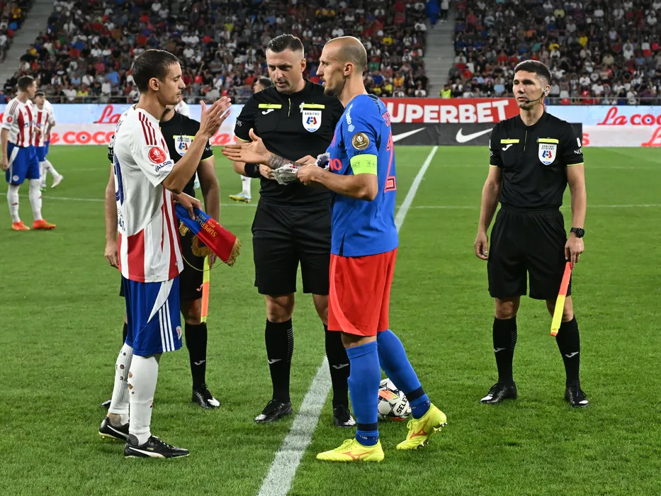Brigada de arbitrii formată din Mircea Orbulet, Andrei Moroita si Ionel Valentin Dumitru alături de căpitanii Juri Cisotti si Vlad Iulian Chiricheș in meciul dintre FCSB si Otelul Galati, contand pentru Superliga Superbet, desfasurat pe Stadionul Steaua-Ghencea din Bucuresti, vineri 26 iulie 2024. © FOTO:Razvan Pasarica/SPORT PICTURES