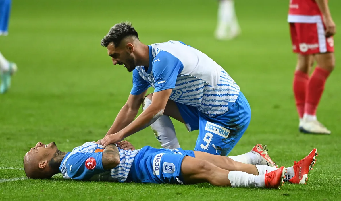Andrei Virgil Ivan alaturi de Ionut Alexandru Mitrita la pamant dupa o accidentare avuta in meciul de fotbal dintre Universitatea Craiova si Dinamo Bucuresti, contand pentru Superliga Superbet, desfasurat pe Stadionul Ion Oblemenco din Craiova, duminica 12 noiembrie 2023. © FOTO:Razvan Pasarica/SPORT PICTURES