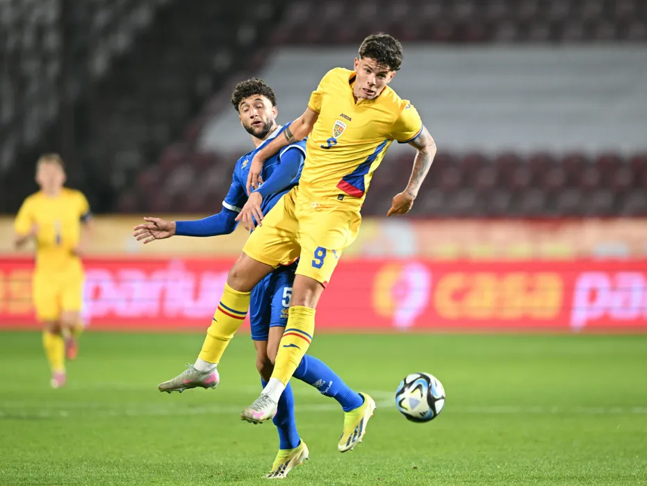 Atanas Trica si Georgios Viktoros in meciul de fotbal dintre Romania U21 si Cipru U21, contand pentru Grupa A de calificare la Campionatul European U21 2027, desfasurat pe Stadionul Dr.Constantin Radulescu din Cluj-Napoca, marti 14 octombrie 2025. © FOTO:Flaviu Buboi/SPORT PICTURES