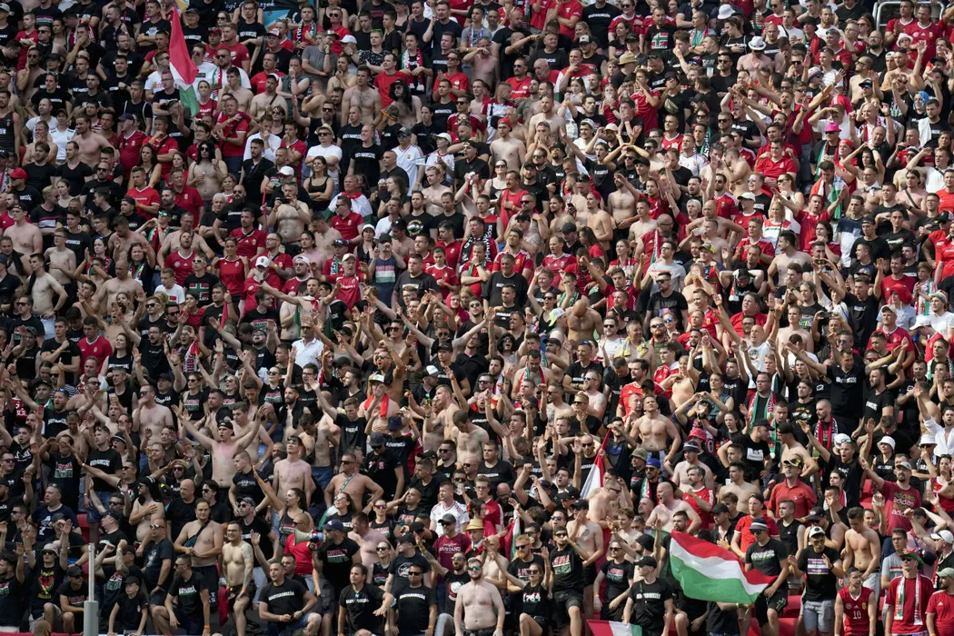 Hungarian fans follow the Euro 2020 soccer championship group F match between Hungary and France, at the Ferenc Puskas stadium in Budapest, Saturday, June 19, 2021. (AP Photo/Darko Bandic, Pool)