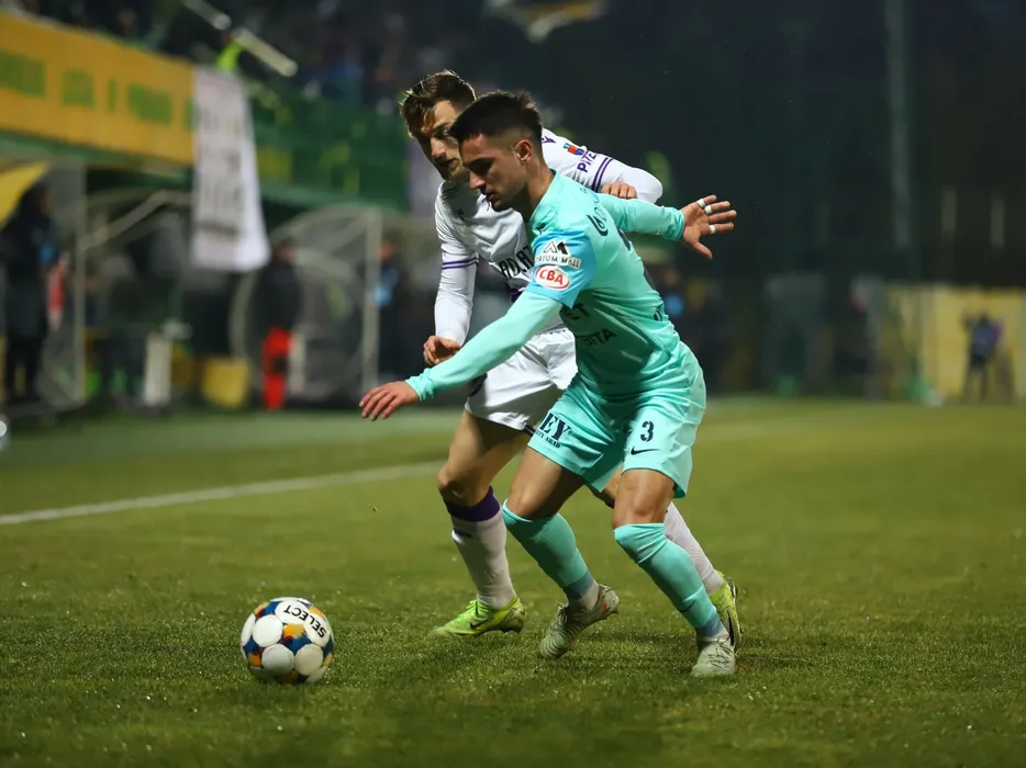 Din Alomerovic si Claudiu Valentin Micovschi in meciul de fotbal dintre FC Arges si UTA Arad, contand pentru Superliga Superbet, desfasurat pe Stadionul Orasenesc din Mioveni, sambata 31 ianuarie 2026. © FOTO:SPORT PICTURES