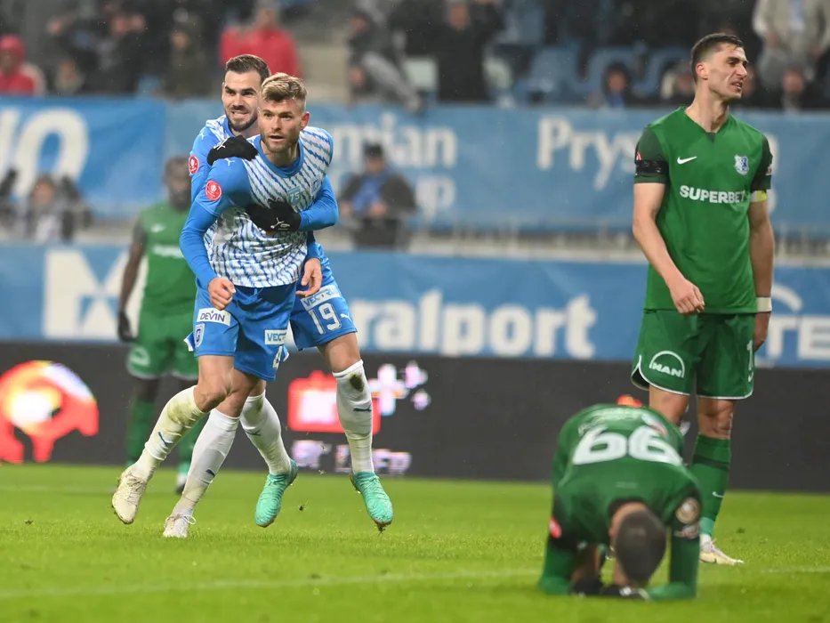 Alexandru Crețu se bucură dupa un gol marcat alături de Elvir Koljic în meciul de fotbal dintre Universitatea Craiova si Farul Constanta, contând pentru Superliga Superbet, desfășurat pe Stadionul Ion Oblemenco din Craiova, duminica 21 ianuarie 2024. © FOTO: Răzvan PĂSĂRICĂ/SPORT PICTURES