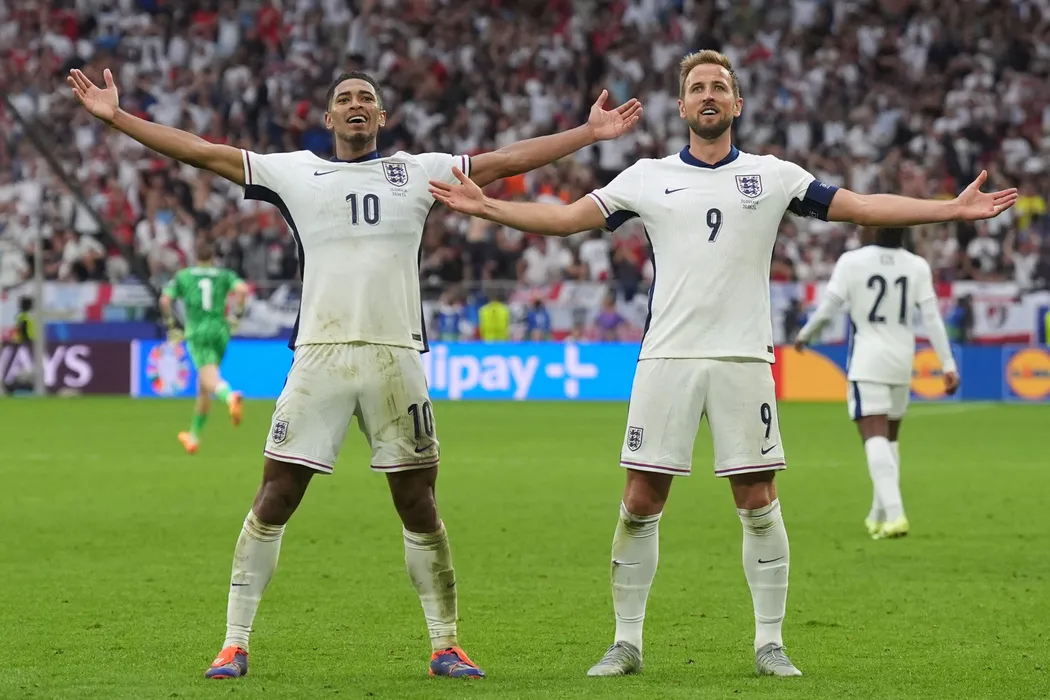 30 June 2024, North Rhine-Westphalia, Gelsenkirchen: England's Jude Bellingham (L) celebrates with England's Harry Kane after scoring his side's first goal during the UEFA EURO 2024 round of 16 soccer match between England and Slovakia at the Schalke Arena. Photo: Marcus Brandt/dpa/HEPTA/SPORT PICTURES