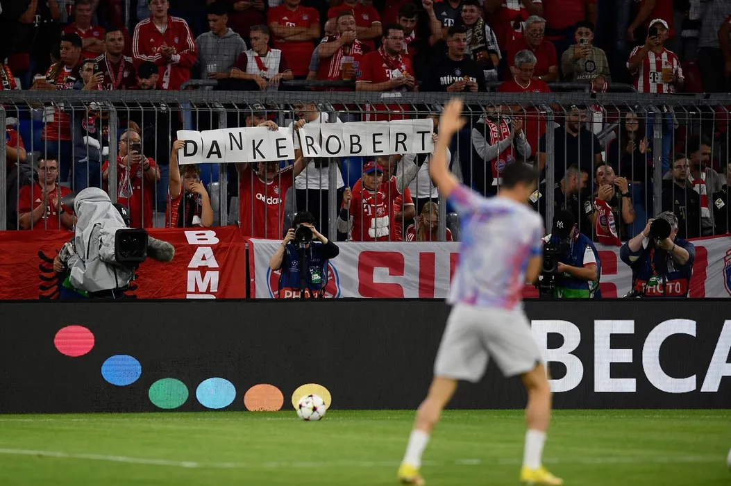 Robert Lewandowski centre-forward of Barcelona and Poland greets his supporters during the UEFA Champions League group C match between FC Bayern München and FC Barcelona at Allianz Arena on September 13, 2022 in Munich, Germany. FC Bayern München v FC Barcelona: Group C - UEFA Champions League, Munich, Germany - 13 Sep 2022,Image: 722409969, License: Rights-managed, Restrictions: RESTRICTED TO EDITORIAL USE, Model Release: no