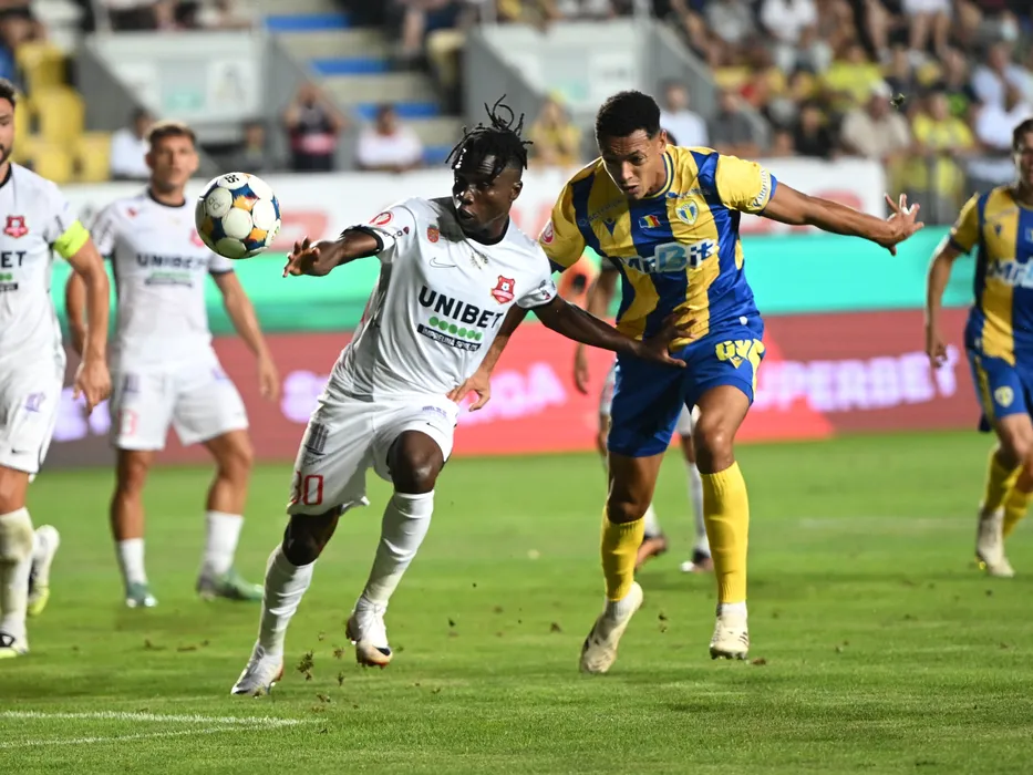 Nana Kwame Antwi si Cedric Benjamin Roche Yohan in meciul dintre Petrolul Ploiesti si FC Hermannstadt, contand pentru Superliga Superbet, desfasurat pe Stadionul Ilie Oana din Ploiesti, sambata 16 august 2025. © FOTO:Razvan Pasarica/SPORT PICTURES