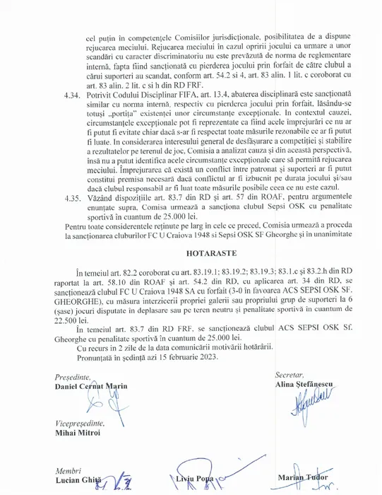 Cum a motivat Comisia de Disciplină și Etică a FRF decizia de a-i acorda lui Sepsi victoria la „masa verde”: „Clubul U Craiova 1948 a înlesnit indirect suporterilor proprii comportamentul xenofob” | FOTO