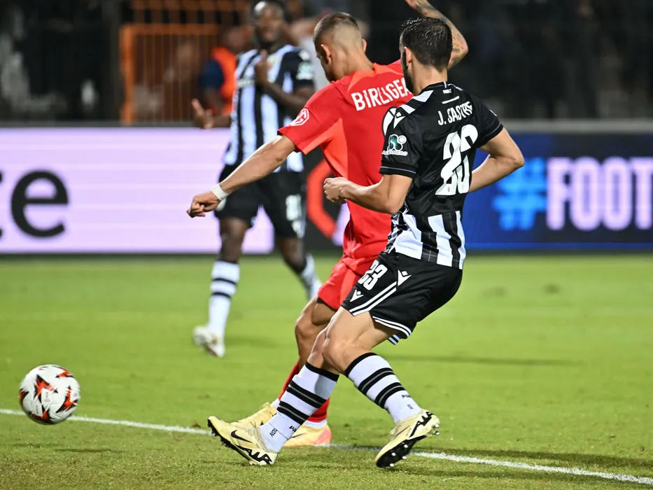 George Daniel Bîrligea marchează un gol de lângă Joan Sastre in meciul dintre PAOK Salonic si FCSB, din cadrul UEFA Europa League, desfasurat pe Stadionul Toumba din Salonic, joi 3 octombrie 2024. © FOTO:Razvan Pasarica/SPORT PICTURES