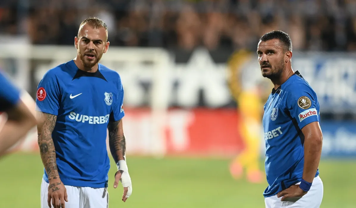 Denis Alibec si Constantin Valentin Budescu la meciul de fotbal dintre Farul Constanta si Flora Tallinn, contand pentru UEFA Europa Conference League, desfasurat pe Stadionul central al Academiei Gheorghe Hagi din Ovidiu, joi 10 august 2023. © FOTO:Razvan Pasarica/SPORT PICTURES