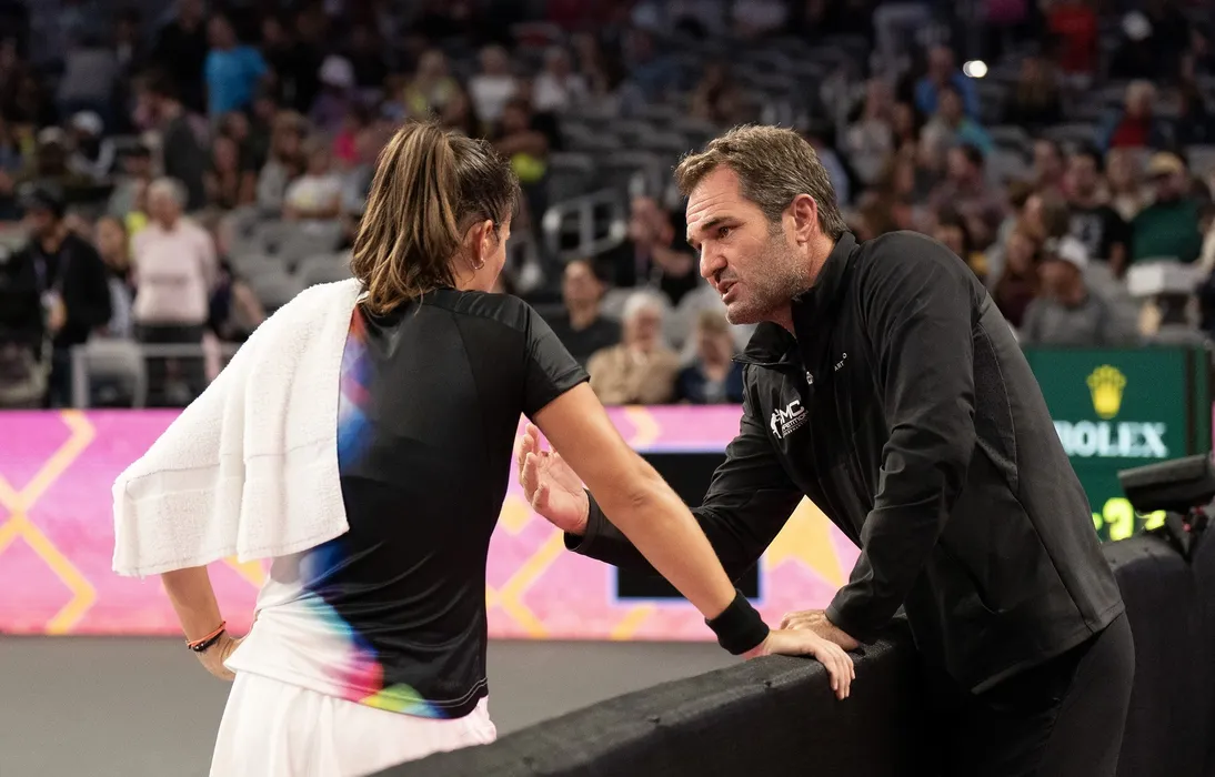 Nov 1, 2022; Forth Worth, TX, USA; Daria Kasatkina talks with her coach, Carlos Martinez, after the end of the first set during her match against Iga Swiatek (POL) on day two of the WTA Finals at Dickies Arena.,Image: 734739575, License: Rights-managed, Restrictions: *** World Rights ***, Model Release: no