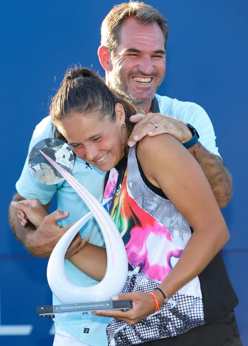 SAN JOSE, CALIFORNIA - AUGUST 07: Daria Kasatkina of Russia holds the trophy alongside her coach Carlos Martinez after defeating Shelby Rogers in the singles finale at Mubadala Silicon Valley Classic, part of the Hologic WTA Tour, at Spartan Tennis Complex on August 07, 2022 in San Jose, California. Carmen Mandato,Image: 712648855, License: Rights-managed, Restrictions: , Model Release: no
