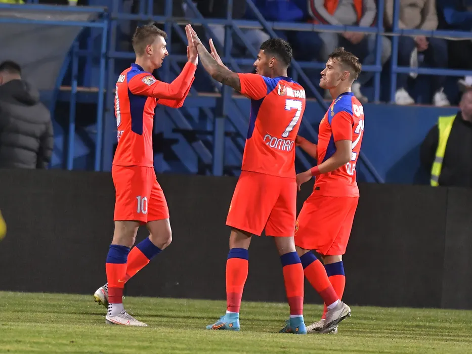 Florin Lucian Tanase se bucura dupa un gol marcat alaturi de Florinel Teodor Coman si Darius Dumitru Olaru in meciul de fotbal dintre Farul Constanta si FCSB, contand pentru Play off-ul Ligii 1 Casa Pariurilor, desfasurat pe Stadionul central al Academiei Gheorghe Hagi din Ovidiu, luni 25 aprilie 2022. © FOTO:Razvan Pasarica/SPORT PICTURES