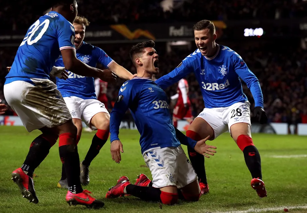 Rangers Ianis Hagi (centre) celebrates scoring his side's third goal of the game during the UEFA Europa League round of 32 first leg match at Ibrox Stadium, Glasgow., Image: 499913374, License: Rights-managed, Restrictions: , Model Release: no, Credit line: Andrew Milligan / PA Images / Profimedia