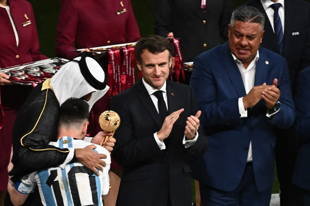 Qatar's Emir Sheikh Tamim bin Hamad al-Thani greets Argentina's forward #10 Lionel Messi next to French President Emmanuel Macron at the end of the Qatar 2022 World Cup final football match between Argentina and France at Lusail Stadium in Lusail, north of Doha on December 18, 2022.,Image: 745401763, License: Rights-managed, Restrictions: , Model Release: no