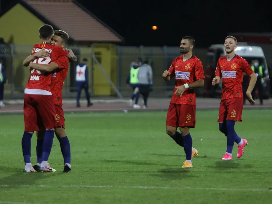 Bucurie stelista cu Dennis Man, Ovidiu Ioan Perianu, Valentin Cretu si Ionut Constantin Pantiru dupa meciul de fotbal dintre Backa Topola si FCSB, contand pentru Liga Europa, desfasurat fara spectatori pe Stadionul Gradski Senta din Senta, joi 17 septembrie 2020. © FOTO:Ciprian Petcut/SPORT PICTURES