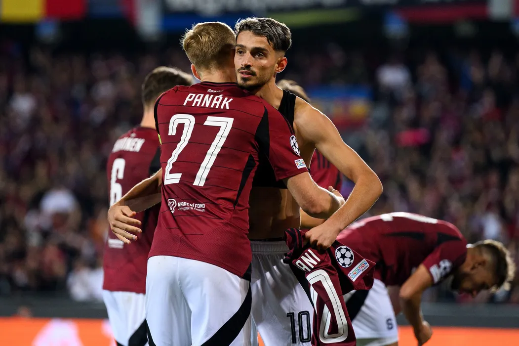 Filip Panák a Albion Rrahmani oslavují druhý gól během utkání play off Ligy mistrů, AC Sparta Praha - Malmö FF, hrané 27. srpna 2024 v Praze.,Image: 902493545, License: Rights-managed, Restrictions: Image must be credited: 'Vlastimil Vacek / Právo / Profimedia', Model Release: no