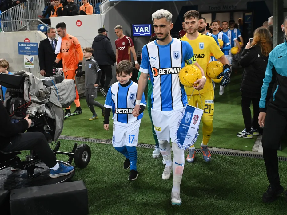 Fotbalistii craioveni Andrei Virgil Ivan si Iulian Laurentiu Popescu intra pe teren la meciul de fotbal dintre Universitatea Craiova si CFR Cluj, contand pentru Play-off-ul Superligii Superbet, desfasurat pe Stadionul Ion Oblemenco din Craiova, duminica 2 aprilie 2023. © FOTO:Razvan Pasarica/SPORT PICTURES