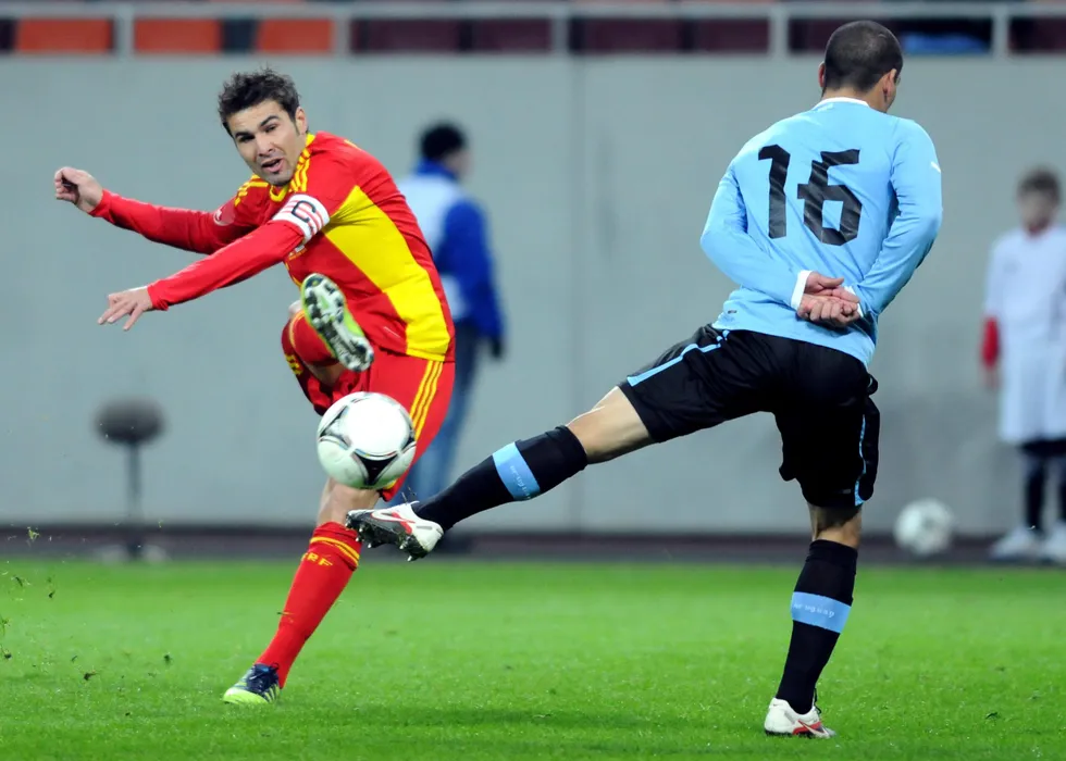 Adrian Mutu (S), de la selectionata Romaniei, se lupta pentru balon cu Maximiliano Pereira Paez (D), de la nationala de fotbal a Uruguayului, in partida amicala disputata, miercuri, 29 februarie 2012, in Bucuresti. LAURENTIU MICH / MEDIAFAX FOTO