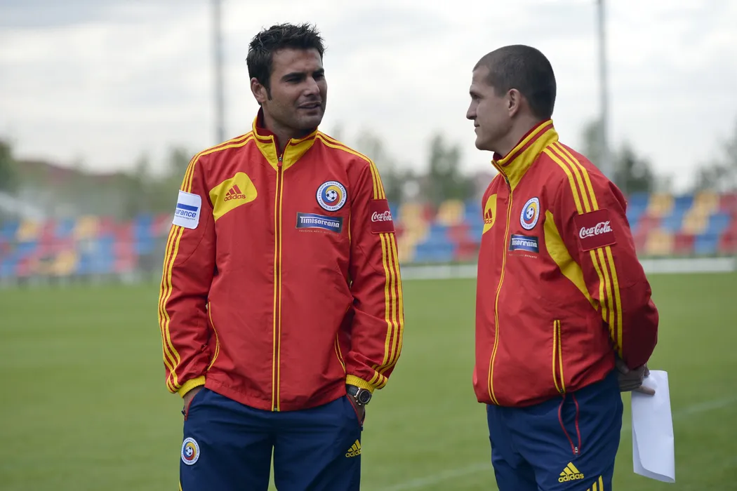 Jucatorii echipei nationale de fotbal a Romaniei, Adrian Mutu (S) si Alexandru Bourceanu (D), discuta la finalul unei conferinta de presa, sustinute cu ocazia reunirii lotului inaintea partidelor cu Turcia si Olanda, din cadrul preliminariilor Cupei Mondiale 2014, in Mogosoaia, luni, 8 octombrie 2012. ALEXANDRU HOJDA / MEDIAFAX FOTO
