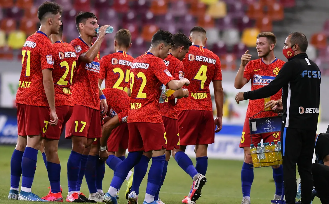Fotbalistii stelisti Andrei Istrate, Lucian Iulian Cristea, Romeo Adrian Nita si Ionut Pantaru la o pauza de hidratare in meciul de fotbal dintre FCSB si CFR Cluj, contand pentru play-off-ul Ligii 1 Casa Pariurilor, disputat fara spectatori pe Arena Nationala din Bucuresti, vineri 31 iulie 2020. © FOTO:Razvan Pasarica/SPORT PICTURES