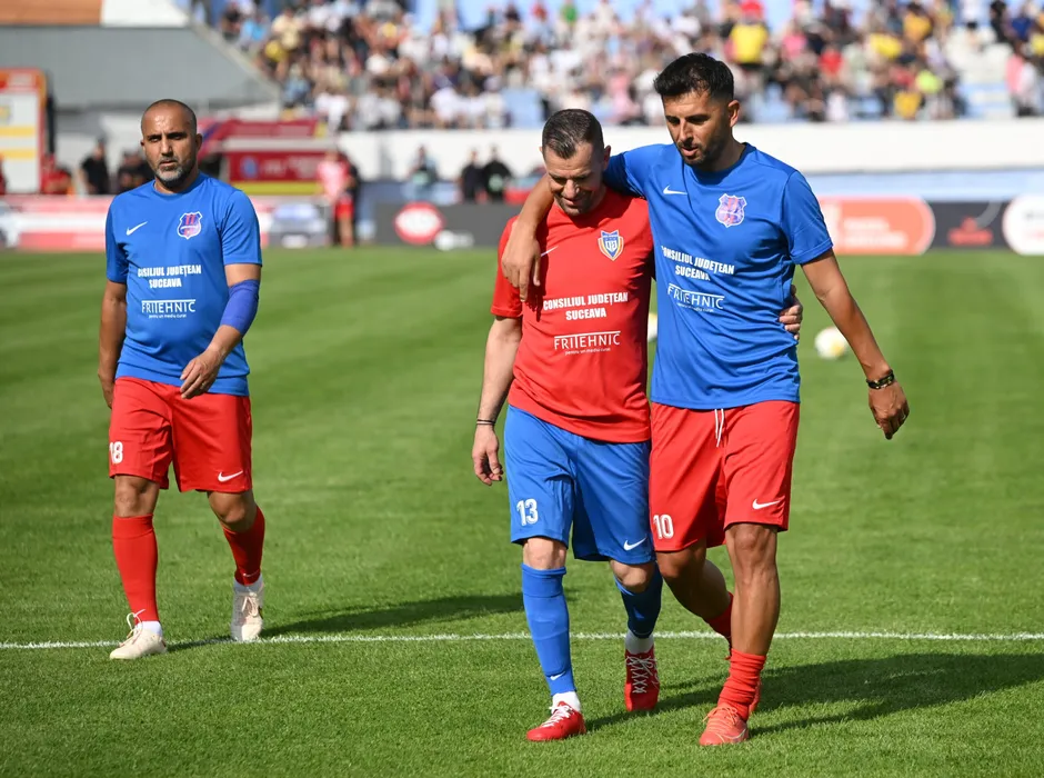 Nicolae Dica, Dorin Semeghin si Petre Marin la incalzire inaintea meciului de fotbal dintre UEFAntasticii si All Stars, meci oficial de retragere al lui Dorin Goian, desfasurat pe Stadionul Areni din Suceava, marti 24 iunie 2025. © FOTO: Tudi/SPORT PICTURES