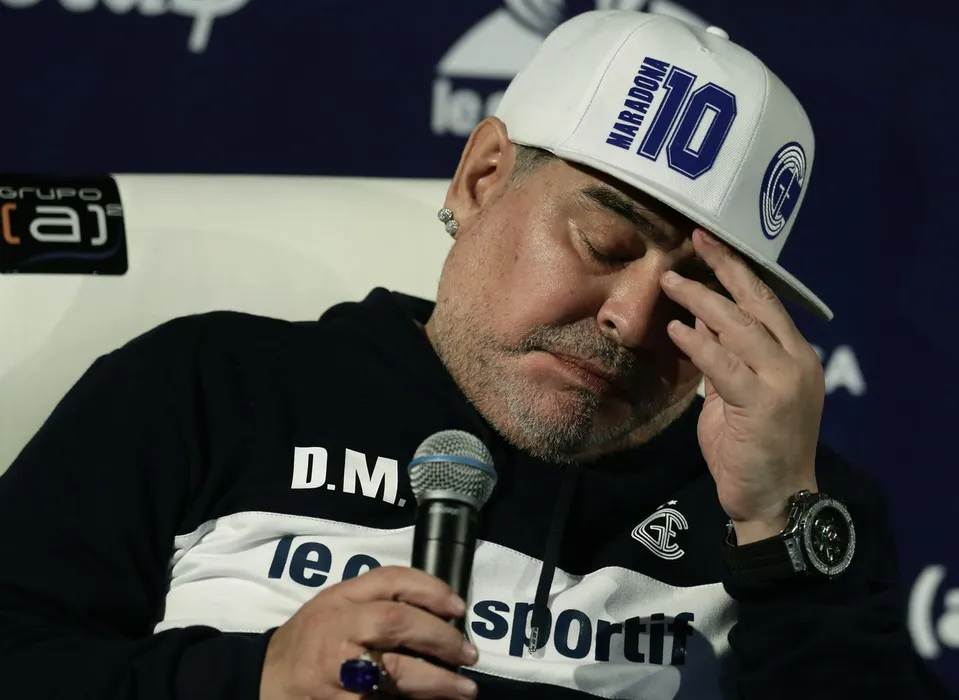Argentine former football star Diego Armando Maradona gestures as he speaks during his first press conference as new coach of Gimnasia, in La Plata, Buenos Aires province, Argentina, on September 8, 2019.,Image: 469786557, License: Rights-managed, Restrictions: , Model Release: no